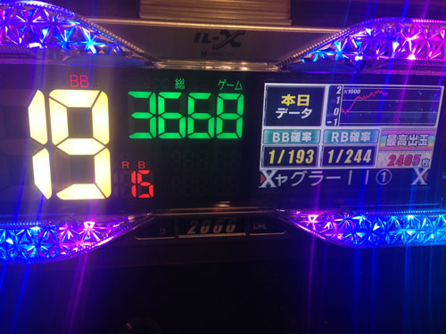3000回転していて合算が良かったのでいつものように座りましたが(とても安易ですが、これで今まで勝てていました)、2000回転回したところで、−1000枚となり合算も230でとても悪かったのでやめました。